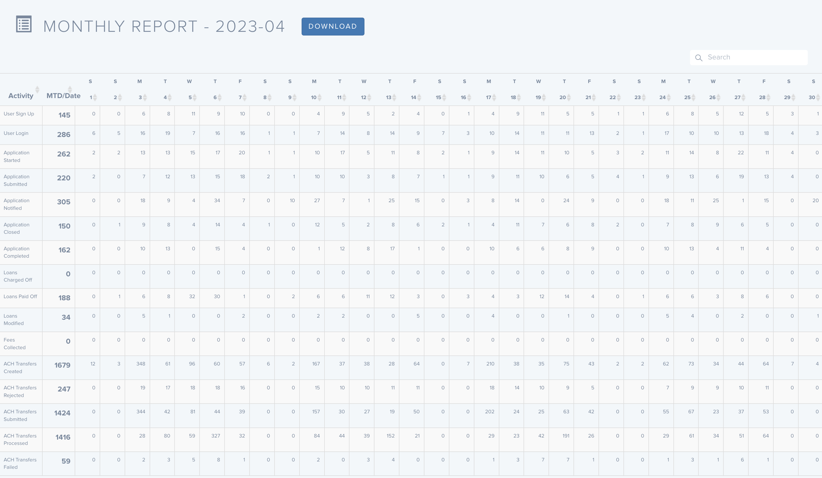 We developed a new reporting tool. Institutional users can monitor the daily activity on the portal from user sign-in to ACH transfers.